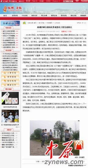 接到爆料,中原網記者打開了網址為 的頁面。這是一篇題為《南湖沙灘公園綠化景觀優化工程完成移交》的新聞,發布時間為2012年5月9日,位于杭州市余杭區政府網站“部門頁面 >>農林集團 >>工作動態”欄目下。