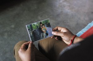 楊其聰的兒媳拿著自己和兒子的照片 文若愚 攝