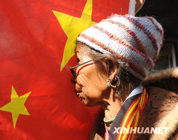 資料圖片:2009年4月5日,老阿媽次仁曲珍虔誠地與天安門國旗護(hù)衛(wèi)隊贈送的國旗碰頭。