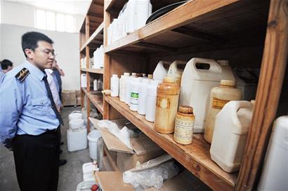 ????進入該公司后,公司張經理介紹,公司主業是儲存、銷售化肥,3年前,聽說生產食品添加劑賺錢就做起了食品配料業務。記者跟隨質監人員來到該公司生產車間,發現車間就是該公司倉庫,打開倉庫大門,緊鄰門口堆積著大量生產食品添加劑的原料:像乙基麥芽酚、食用香精等。隨后檢查人員進入生產車間,發現該廠對生產車間進行了改造,更衣間和消毒室都進行了簡化,消毒室的洗手盆都沒有水龍頭,記者沒有經過任何消毒程序,就進入了生產車間,車間內兩名工人正將一些白色粉狀物從紅色塑料盆里裝到透明袋中,兩名工人的穿戴都不符合食品安全要求,而且加工車間窗戶開著,根本沒有無菌操作。