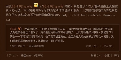 繼助理打人事件后,李小璐曾出面替助理道歉,也曾可憐表示事發(fā)當天自己因為外公去世而在強顏歡笑想退出娛樂圈,甚至口口聲聲地說一直很尊重記者。而今日上午,李小璐卻又在微博上和娛樂記者發(fā)生“爭執(zhí)”,并稱“不會可憐兮兮為通稿而低頭。”并秀了一段英文,夸三歲就拍戲,感覺很偉大!