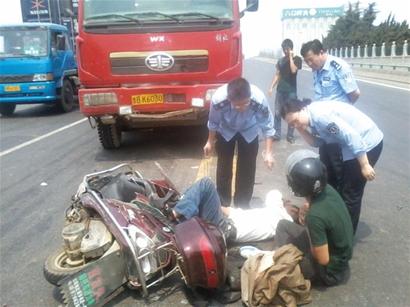 ????一輛踏板摩托車沿著瑞昌路自西向東疾馳,來到萬安路附近時,突然在路上左轉彎,同向行駛的自卸車緊急剎車,但還是將摩托車撞倒在地。昨天上午11時左右,120救護車趕到事發現場時,戴著頭盔的摩托車司機肋骨骨折,疼得站不起身來,坐在摩托車后座的男子后腦勺撞在地上,鮮血一直往外涌。兩名傷者隨即被送往海慈醫院治療。