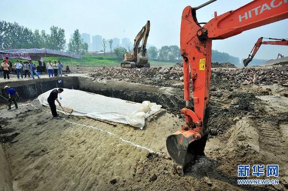 5月28日拍攝的天津市北辰區張灣村明代沉船遺址考古發掘現場。近日,天津市文化遺產保護中心在京杭大運河天津段考古發掘出兩艘明代沉船,出土元、明、清時期銅、鐵、瓷、陶、骨、木、竹等不同質地文物及標本600余件。這兩艘沉船均為木質結構,第一艘沉船損毀嚴重。第二艘沉船整體保存較好,呈東西向覆扣在河道底部,全長約13米。這兩艘沉船的發現對于研究中國古代漕運史、水利史、船舶發展史都有非常重要的價值,同時,也為京杭大運河申遺提供了重要的實物證據。