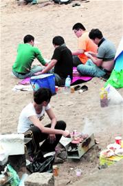 ????青島雕塑園管理辦公室的陶主任告訴記者,去年主要是周末有人來燒烤,今年不但周末人數增加到上百人,平常每天也都有20多人,人數比去年增加了五成多。“我們8名保安根本不夠用,攆走了這撥,又來了那撥,態度好的換個地方繼續燒烤,態度不好的連聽也不聽。”陶主任說,每一次燒烤對環境都是一次傷害,除了玻璃碴子、鋼釬子容易傷人外,燒烤后撒漏的油污更是難以清除,20名環衛工人每天要清理出1噸多燒烤垃圾,不少油污都是工人手把手地從沙子里摳出來的。