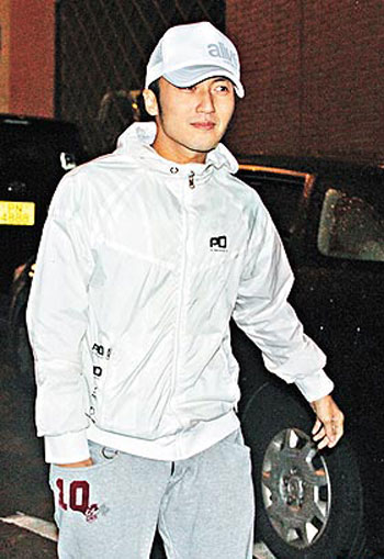 霆鋒前晚穿上白外套和cap帽同好友吃飯,離開時露出微笑神情輕松