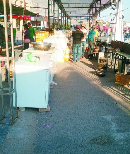5月17日上午10時(shí)左右,記者按照劉先生的指引來(lái)到蘭州東路。在一個(gè)寫(xiě)著“阿里巴巴烤肉”的攤位前,記者以想開(kāi)一個(gè)燒烤攤為名,跟這個(gè)攤位上一名姓陳的女士聊了起來(lái),據(jù)陳女士介紹,這些烤肉攤都不是長(zhǎng)期設(shè)在這里的,干幾天就走,四處打游擊。在烤肉攤后面,記者看到堆了40多個(gè)白色的泡沫箱子,封箱子的透明膠布上寫(xiě)著“科爾沁烤肉”字樣。陳女士告訴記者:“這些肉都是老楊送來(lái)的,老楊一車(chē)一車(chē)地給送貨,我們家這堆全是他送的。”
