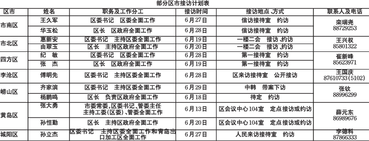 ????記者近日了解到,青島12區(qū)市領(lǐng)導(dǎo)干部6月接訪計劃表出爐,市直重點(diǎn)單位領(lǐng)導(dǎo)干部接待群眾來訪安排也已敲定,本報選取6月份部分區(qū)市“一把手”接訪的時間和地點(diǎn)安排予以刊登,有需求的市民可登錄青島政務(wù)網(wǎng)查詢詳情。