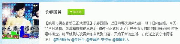 知名娛樂爆料人長春國貿于6月4日22點08分發布微博,曝光姚晨與曹郁已于4月初低調結婚領證,婚禮日期尚未確定。和凌瀟肅離異之后,姚晨的感情問題受到媒體的高度關注,繼2011年3月底被媒體拍到和曹郁出雙入對的照片之后,性格直率的姚晨索性公開了與曹郁的新戀情,并表示希望得到大家的祝福。