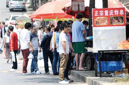 走進青島寫字樓集聚地及部分高校園區你會發現,與寫字樓里和校園內安靜的環境相比,這些地方熱鬧非凡。伴隨著鍋碗瓢盆的敲擊聲和高亢的叫賣聲,燒烤、炸貨、涼皮、拌菜和各種風味小吃的香味撲鼻而來。與食堂內較為單調的飯菜相比,這些廉價又夠“香”的風味小吃成為大學生和白領們的最愛,但記者在3