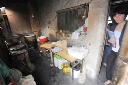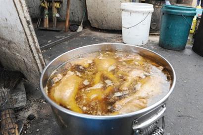 記者隨后來到青大一路的丁字路口,由于中國海洋大學浮山校區、青島大學東院、青島大學師范學院三個校區和宿舍區均聚集于此,因此這里聚集了更多的小吃攤,排隊購買小吃的學生擠到了馬路上,加之青大一路有公交車通行,一些流動小吃攤又擺到了馬路上,交通一度癱瘓。在丁字路口東北側有一個廢品收購站,而廢品收購站門前也被流動小吃攤擠得水泄不通,這里的環境可想而知,但依然不影響小吃攤“生意興隆”。記者看到,這些流動小吃攤上的食品多沒有遮蓋,調料、原材料直接存放在盆里,用時隨手抓來放入鍋中,不時還有蒼蠅飛到食物上,一家銷售蛋炒飯的攤位,調料有十幾種,都敞口放在不銹鋼的碗里,一桶1.5L的可樂瓶子里放著半瓶子油,這些調料和油從何而來都無從得知。