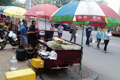 香港東路上云集了中國海洋大學浮山校區、青島大學東院、青島大學師范學院三個校區,是名符其實的大學城,周邊也是寫字樓云集,流動小吃攤也瞅準了大學城這塊巨大的商機,每到飯點,商販便從四面八方聚集到大學城周邊叫賣,“圍攻”在大學城周邊。