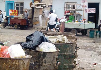 忙碌了近一個小時,前來買飯的人終于有所減少,但此時發生的一幕卻讓人感到極不舒服,在整理飯菜時,一條雞腿夾雜著部分飯菜掉落在車廂內一塊布滿黑色油污的紙上,而店老板卻沒有想把這些飯菜扔掉,而是直接將雞腿放回盛菜的塑料盆里,幾分鐘后這條雞腿賣給了一個前來買飯的男學生。