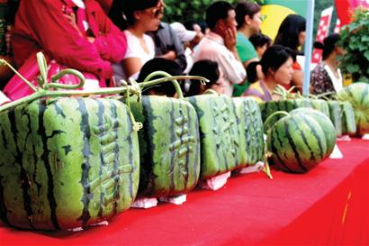 ????瓜農吳京華告訴記者,這種方形的西瓜被瓜農們稱為“吉祥”瓜。這種西瓜不僅外形特殊,瓜上還有“喜”“壽”“福”“祿”等吉祥話。記者了解到,培育這種方形西瓜非常麻煩,“在西瓜小的時候就需要裝進模具里面,如果稍微不小心就可能開裂。 ”瓜農介紹說,就口味而言,這種方形瓜和普通西瓜沒什么兩樣,完全可以放心食用。但是,方形西瓜目前還在進一步研發培育中,不能大量上市。市民要想吃到還得等上幾年。