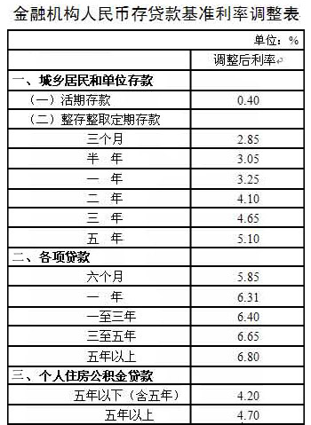 ????中國人民銀行決定,自2012年6月8日起下調金融機構人民幣存貸款基準利率。金融機構一年期存款基準利率下調0.25個百分點,一年期貸款基準利率下調0.25個百分點;其他各檔次存貸款基準利率及個人住房公積金存貸款利率相應調整。