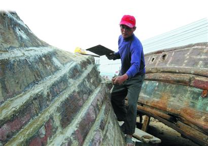 ????岸上有六七條漁船正在上塢,旁邊是一群正在打撲克的船員。記者問附近有沒有外地來的船員時,他們順手向旁邊一指,“在那邊,他們正在修船呢。”記者順著他們指的方向,走到了另外一處人多的地方。