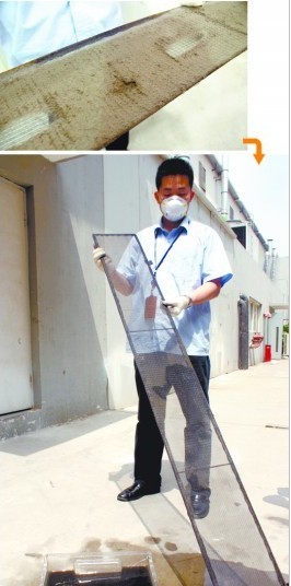 ????“清洗的話,肯定不能在辦公室里面,因為實在太臟了。”小林告訴記者,需要把過濾網放到室外進行沖洗,然后消毒才能重新安裝。記者看到,清洗員用水龍頭進行清洗,流到地面的水立即變成了黑色,儼然一條“黑水河”。