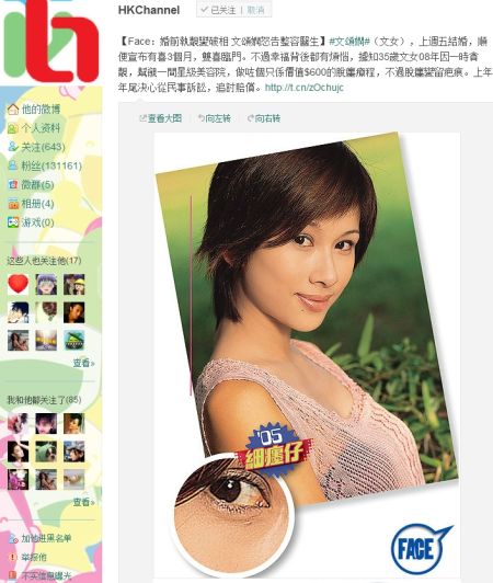 HKChannel于2012年3月6日20點07分發布的這條微博,附上了香港《FACE周刊》第250期的詳細報道全文,及文頌嫻接受整形前后的對比照片。