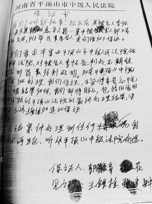 據記者了解,這份保證書簽訂后不久,平頂山中院作為一審法院,對李懷亮案進行了開庭審理。2004年8月3日,平頂山市中院作出一審判決,以被告人李懷亮犯故意殺人罪判處死刑,剝奪政治權利終身,并賠償附帶民事訴訟原告人經濟損失3000元。