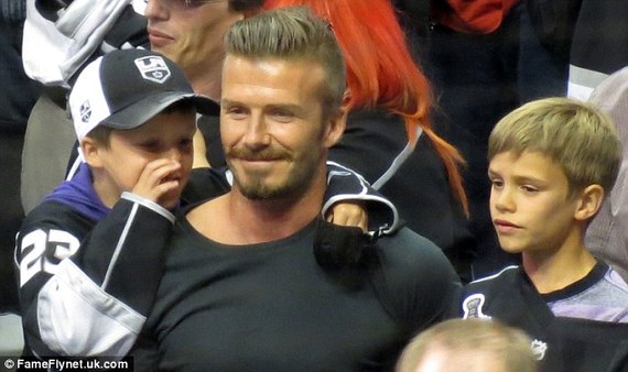 當地時間2012年6月11日,美國洛杉磯,貝克漢姆帶著三個兒子現身斯泰普斯中心觀戰NHL冰球總決賽。小貝不時與孩子親密互動,父子同樂的畫面非常溫馨。