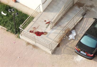 ????記者接到線索趕到事發地時,警方在樓下設置了100多米長的警戒線,旁邊停著6輛警車,20多名民警在現場勘查,其中10多名民警上到了16層樓頂。記者爬到對面樓上查看,發現55號樓頂刑警正在勘查現場。一對中年夫婦在向他們講述事發經過。記者在高處看到,一名穿著黑色衣褲的男青年頭朝北腳朝南,面朝下,趴在該樓樓梯出口前的過道上,鮮血從他頭部流出,旁邊過道的不銹鋼扶手也被砸凹陷,13樓的防盜窗也被砸得歪斜。
