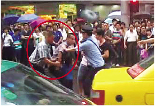 事發地點正好位于斑馬線上,很快引起了交通堵塞。事發突然,被劫持小孩的父母一時不知如何應對,站在馬路上但又不敢太靠近以免刺激劫持者。小孩的爸爸定下神后,開始跟劫匪談判。
