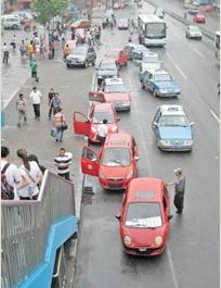 在杭州路乘客出口處,三輪摩托車大軍更為“壯觀”,十幾輛摩托車擠在一起,不少車主拿著印有 “海底世界”、“歡動世界”、“嶗山旅游”等字樣的牌子詢問出站的乘客要不要車。
