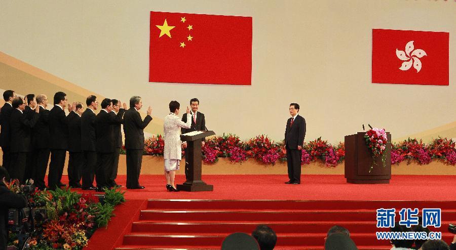 7月1日,中共中央總書記、國家主席、中央軍委主席胡錦濤出席慶祝香港回歸祖國15周年大會暨香港特別行政區第四屆政府就職典禮。這是香港特別行政區第四屆政府的主要官員在梁振英帶領下宣誓就職,胡錦濤主席監誓。新華社記者鞠鵬攝