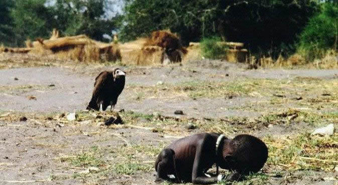 這張照片拍攝于1993年蘇丹饑荒時期。這個孩子身上表現出來的無助與絕望,和禿鷹捕食時的耐心形成鮮明對比。這張照片深刻反映了饑荒的殘酷,令其迅速成為全世界關注的焦點。攝影師憑借這張照片獲得了普利策獎,但不久之后就自殺身亡。