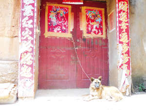 下午2點,李國春家的門緊鎖著,門口的血跡雖已被村民用石灰覆蓋,但仍有不少血跡滲出來。母子倆養了5年的“老黃”被拴在門閂上,似乎在等待著主人的歸來。