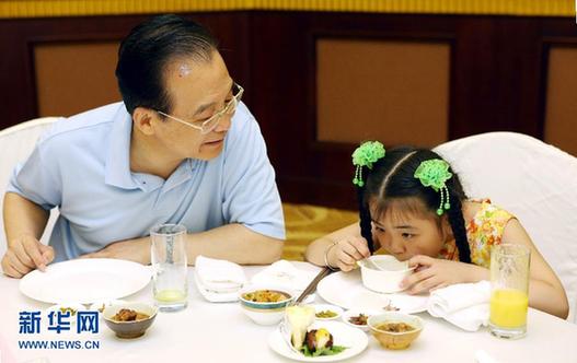 7月13日至15日,中共中央政治局常委、國(guó)務(wù)院總理溫家寶到四川省成都市就當(dāng)前經(jīng)濟(jì)形勢(shì)進(jìn)行調(diào)研,并在成都主持召開河南、湖南、廣西、四川、陜西五省區(qū)經(jīng)濟(jì)形勢(shì)座談會(huì)。 7月14日晚,溫家寶總理專門將王佳淇、趙其松、段志秀、郎錚、劉小樺、宋馨懿等6名汶川地震災(zāi)區(qū)學(xué)生請(qǐng)到住地,和他們一起用晚餐,并給他們每人寫了一段寄語(yǔ),勉勵(lì)他們自信自強(qiáng)、努力奮斗,愿他們愉快、健康、進(jìn)步。這是溫家寶和宋馨懿在一起。
