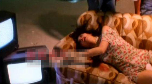 《古惑仔之只手遮天》劇照。鄭伊健的女友,被張耀揚抓住,先奸后殺,劇照為被殺前夕的反抗。