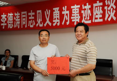 ????7月20日上午,膠州市召開李德濤見義勇為事跡座談會,該市交通運輸局黨委做出了在全市交通運輸系統開展向李德濤學習的決定。該市交通運輸局向李德濤頒發了蘋果平板電腦、中達公司黨委頒發了5000元的獎金,以勉勵他見義勇為的壯舉。
