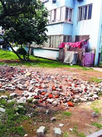 從小區南門進入,剛過鐵門一堆沙土便擋在了記者面前,占據了大部分馬路。一名拿著馬扎準備外出乘涼的小區居民說,沙土是最近幾天才堆放在這里的,目的就是為了把小區坑洼不平的馬路填平。不過,工人把沙土全都堆在居民進出的路上,給大家的生活帶來了很大的影響。在沙土堆西側的綠地上,還鋪了一大堆碎石頭,過去種的花草被壓在石頭下面,有的已經干枯死了。 “不知道是誰放的,反正有段時間了。 ”該居民說。