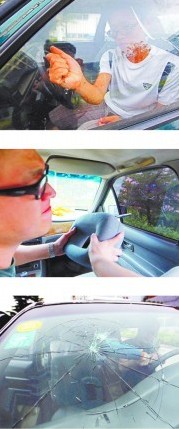 用力揮出手中的方向盤鎖,記者聽見一聲脆響,前風擋玻璃裂出了蜘蛛網紋。記者連續擊打了3次,不少碎玻璃飛濺出來,但玻璃的整體狀況還是沒有大的變化。隨后記者用方向盤鎖擊打側窗玻璃,兩下砸出了一個窟窿。