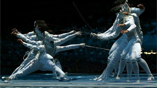 多重曝光相結(jié)合的攝像頭下的韓國(guó)與烏克蘭進(jìn)行的女子花劍比賽