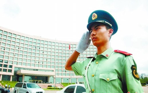 市政府門口的崗哨,武警戰士每天風雨無阻地在這里執勤站崗,期間必須保持一個姿勢,一動不動,滿頭大汗都不能擦。
