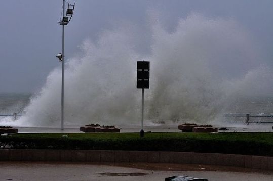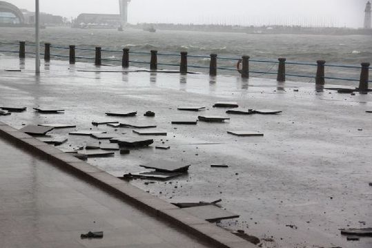 受昨夜臺風(fēng)“ 達(dá)維”帶來的巨大海浪的影響,音樂廣場有不少的地板磚被巨浪沖毀。(青島新聞記者陳志偉攝影報道)