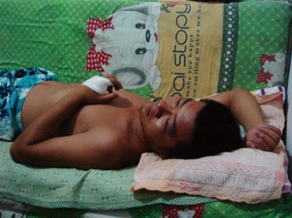 在廚師長(zhǎng)牛明軍的帶領(lǐng)下,記者來到了于佳的休息室,記者看到他的右腳拇指根部被磨得不輕,右小腿肚上有大片血紅傷口,于佳的胳膊上、腿上和后背上,總共有7處外傷,纏滿大片紗布。
