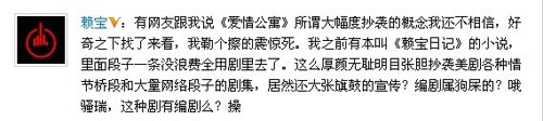 電視劇《愛情公寓3》目前正在熱播,很多觀眾包括名人都表達了對這部作品的喜愛。但8月4日凌晨,微博上的“段子”名人賴寶稱,該劇在未經(jīng)授權的情況下使用了數(shù)量龐大的他的原創(chuàng)段子。14時許,該微博已被轉(zhuǎn)發(fā)1萬6千余次,評論達7千多條。15時左