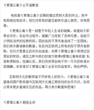 針對網(wǎng)友質(zhì)疑的《愛情公寓》抄襲美劇各種情節(jié)橋段和大量網(wǎng)絡段子,《愛情公寓》出品方發(fā)布公開信稱,若使用過網(wǎng)友原創(chuàng)橋段,可與劇組聯(lián)系,按原創(chuàng)千字一萬元標準補償稿酬,并向作者致歉。