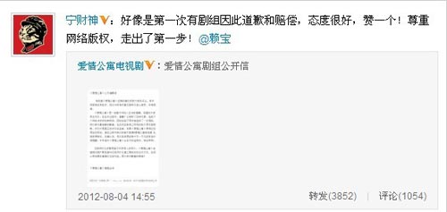 對于《愛情公寓》出品方的做法,知名編劇寧財神給予了肯定:“好像是第一次有劇組因此道歉和賠償,態(tài)度很好,贊一個!尊重網(wǎng)絡版權,走出了第一步!”他也正是從網(wǎng)絡寫手起家。而當事人賴寶也轉(zhuǎn)發(fā)了致歉信并表示很欣賞劇組的作法,不會要求賠償。