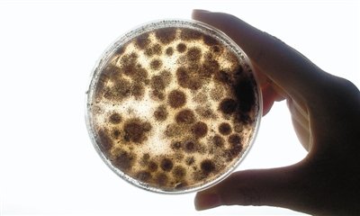 實(shí)驗(yàn)4中,散熱片清洗前的樣本,霉菌培養(yǎng)皿中長(zhǎng)出大片霉斑。