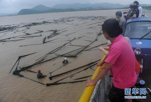 8月8日,浙江寧??h胡陳港水庫,人們在被大水帶來的網箱內捕魚。