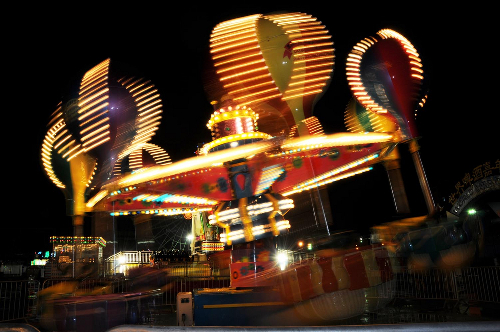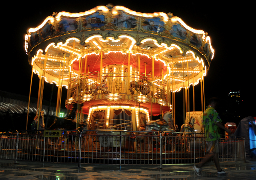 場地上,多姿多彩的燈樹美輪美奐,造型獨特的30余盞歐式環保庭院路燈處處流露著古典優雅的歐陸風情。8盞高亮度探照燈全力打造不夜城。35余盞高達6米的金屬鹵化燈和50余盞的圓形射燈點亮嘉年華各個角落,嘉年華設備群燈閃耀,僅摩天輪和跳樓機兩個設備上的燈就有萬余盞。夜幕降臨,華燈齊放,繽紛璀璨。