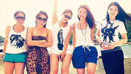 Elva(右二)和蔡恩真(中)個個著得性感清涼,惟獨茍蕓慧(右)衣著保守