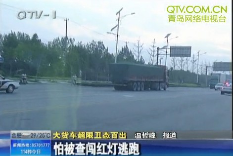 ????可大貨司機做賊心虛,不顧十字路口紅燈閃亮,急速闖燈后沿馬路逆行逃跑。由于此時過路車輛較多,執法人員只能在外圍追隨,最終在5公里外的一段公路上將貨車逼停。晚上10點