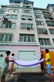 附近一名女士聽到了呼救聲,趕緊從家里拿出三床棉被,和大家一起撐開,做成了一張臨時的防護(hù)網(wǎng),以免小女孩發(fā)生意外墜落。見到樓下的人越來越多,小女孩的情緒也愈加激動,動作幅度也越來越大,但是哭聲卻越來越小,整個小臉憋得發(fā)紫。