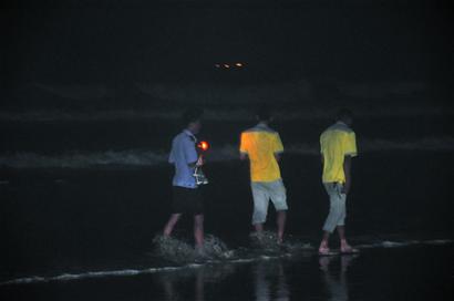 ????“現在過去4個多小時了,一直沒見到人!”前晚10時許,浴場工作人員小趙和多名同事已經在沙灘上走了至少三個來回。記者看見,此時天色已經漆黑一片,而浴場沒有燈光照明,救生隊員們一面找,一面還得避讓地上的“陷阱”——白天有不少在海邊玩沙子的游客挖出了一個個的積水坑,最深的有20多厘米。隊員們每走出幾步,就得低頭望一望腳下。 “浴場有13名保安,9個救生員和8個工作人員在附近拉網式尋找,3000多米的海灘都要找。 ”浴場工作人員寧先生介紹道。而派出所和其他警隊也有16名民警和協警員在海灘上尋找。昨日零時許,老孟的遺體被海浪沖到岸邊。