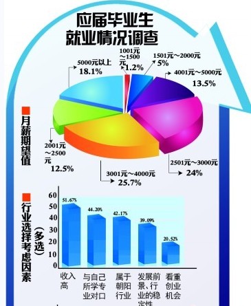 ????今年整體數據同去年相比,整體薪酬期望高于去年。每月1501元至2000元之間下降了6個百分點,2001元至2500元之間下降了11個百分點,2501元至3000元之間基本持平,3001元至4000元之間則上升了近5個百分點,4001元至5000元之間則上升了近8個百分點,5000元以上也上升了8個百分點。