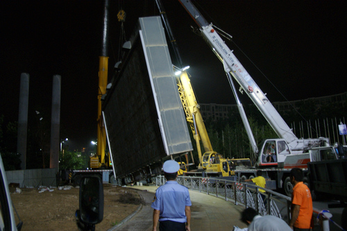 ????鑒于該處廣告形體巨大,地處福州南路與東海西路交界交通要道,回避交通高峰的拆除時間窗口有限,施工難度大,技術要求高,為順利拆除該處廣告,市城管執法局直屬大隊執法人員積極協調公安交警、熱電公司和園林公司等多部門和單位,經過一周的前期準備工作,動用了30多人的施工隊伍、三輛大型吊車同時施工,最終順利拆除了該處巨型廣告設施,使該區域視覺空間效果更加敞亮,空間環境更趨有序。(記者 王安)